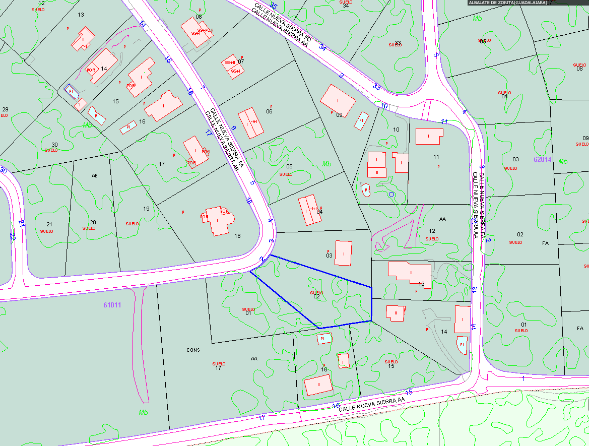 TITULARIDAD: 25% PLENO DOMINIO. URBANA. EN TÉRMINO MUNICIPAL DE ALBALATE DE ZORITA. PARCELA DE TERRENO SEÑALADA CON LOS NÚMEROS UNO Y DOS DEL POLÍGONO AA -AA-1 Y AA-2-, QUE FORMA PARTE DEL CONJUNTO URBANÍSTICO RESIDENCIAL DENOMINADO NUEVA SIERRA . TIENE UNA SUPERFICIE DE DOS MIL METROS CUADRADOS, Y LINDA AL NORTE, PARCELA AA-3 Y AVENIDA DE AMÉRICA SUR, PARCELAS AA-LS, AA-16 Y ZONA HÍPICA ESTE, PARCELAS AA-3, AA-13 Y AA-14 Y OESTE, ZONA HÍPICA DENTRO DE LA URBANIZACIÓN. LA DESCRIPCIÓN INDICA QUE CORRESPONDE CON LAS PARCELAS 1 Y 2. CORRESPONDE LA PARCELA 1, CON LA REFERENCIA CATASTRAL 6101101WK1660S0001BA Y PARCELA 2 CON REFERENCIA CATASTRAL 6101102WK1660S0001YA.