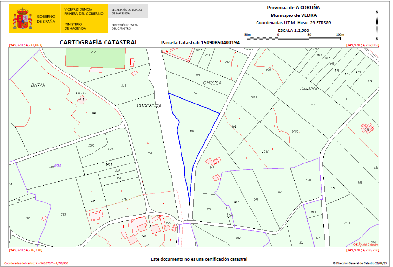100% PLENO DOMINIO DE PARCELA NÚMERO CIENTO NOVENTA Y CUATRO DE LA ZONA DE CONCENTRACIÓN PARCELARIA DE SAN PEDRO DE VILANOVA Y SAN CRISTÓBAL DE MERÍN, MUNICIPIO DE VEDRA. LABRADÍO, PRADO Y MONTE AL SITIO DE CHOUSA, DE CINCUENTA Y OCHO ÁREAS Y VEINTIUNA CENTIÁREAS. LINDA: NORTE, LA FINCA CIENTO NOVENTA Y SIETE SUR, CAMINO ESTE, LA FINCA CIENTO NOVENTA Y SIETE Y CAMINO Y OESTE, TERRENOS DE DOMINIO DEL FERROCARRIL DE SANTIAGO A ORENSE. POR EL LINDERO ESTE DE LA FINCA QUE SE DESCRIBE DISCURREN Y PENETRAN VARIOS REGATOS Y ES CRUZADA POR UNA CONDUCCIÓN SUBTERRÁNEA DE AGUA.