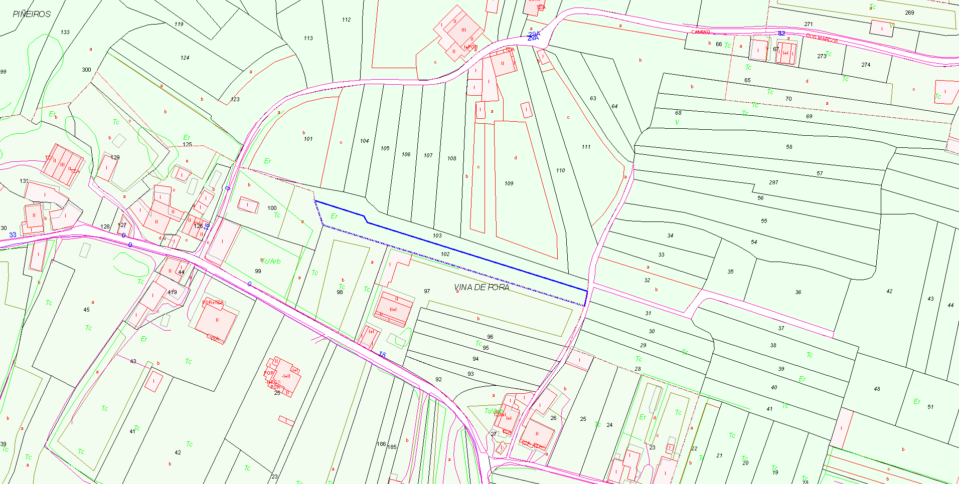 RUSTICA: DENOMINADA VEIGA , A 1ABRADIO Y VIÑA, SITA EN EL LUGAR DE PIÑEIROS, PARROQUIA DE VILLALONGA, MUNICIPIO DE SANXENXO, DE OCHOCIENTOS SETENTA Y SEIS METROS CUADRADOS. LINDA: NORTE: CAMINO SUR: WENCESLAO FLORENTINO CASTERO OZORES ESTE, HEREDEROS DE ROSA CACABELOS Y OESTE: CARMEN MIGUEZ.