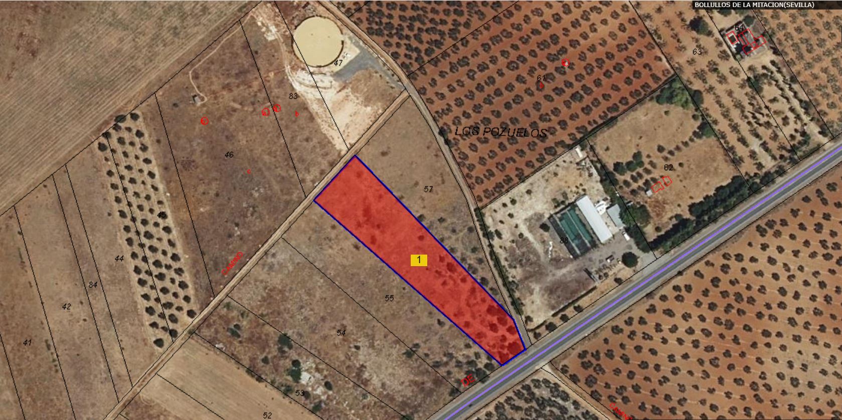 100% PLENO DOMINIO. - RUSTICA: SUERTE DE TIERRA POBLADA DE OLIVOS, AL SITIO DE LOS POZUELOS EN BOLLULLOS DE LA MITACION. SUPERFICIE: 49 AREAS, 91 CENTIAREAS, 53 MILIAREAS. LINDA: NORTE, FINCA DE FRANCISCO GUZMAN GODOY SUR, FINCA DE FRANCISCO MORENO GUTIERREZ ESTE, CARRETERA DE SEVILLA A BOLLULLOS DE LA MITACION OESTE, CAMINO DE LOS POZUELOS.