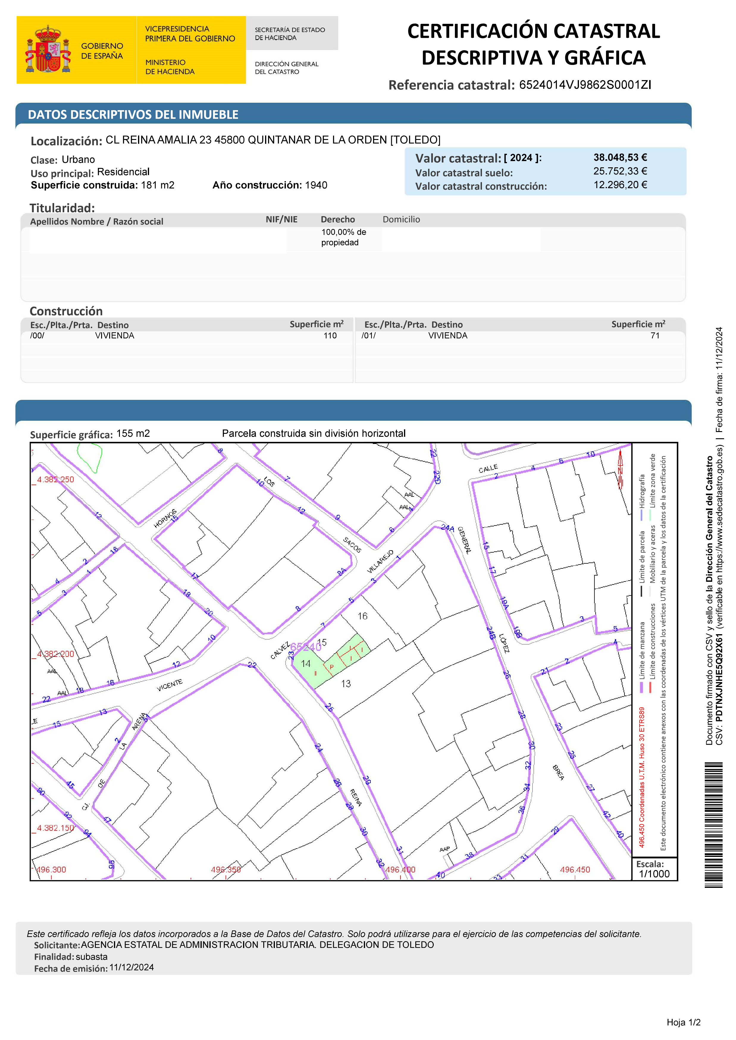 URBANA: CASA SITA EN QUINTANAR DE LA ORDEN, EN LA CALLE REINA AMALIA, NUMERO 23, COMPUESTA DE VARIAS HABITACIONES Y DEPENDENCIAS CON UNA EXTENSION SUPERFICIAL DE CIENTO SESENTA Y CUATRO METROS Y DOCE DECIMETROS CUADRADOS. LINDA FRENTE, CALLE DE SU SITUACION DERECHA ENRANDO CON LA DE CEFERINA SANCHEZ GRANDE IZQUIERDA, CON LA CALLE DE VICENTE GALVEZ A LA QUE HACE ESQUINA Y FONDO H. LEANDRO SIERRA MOLINA.