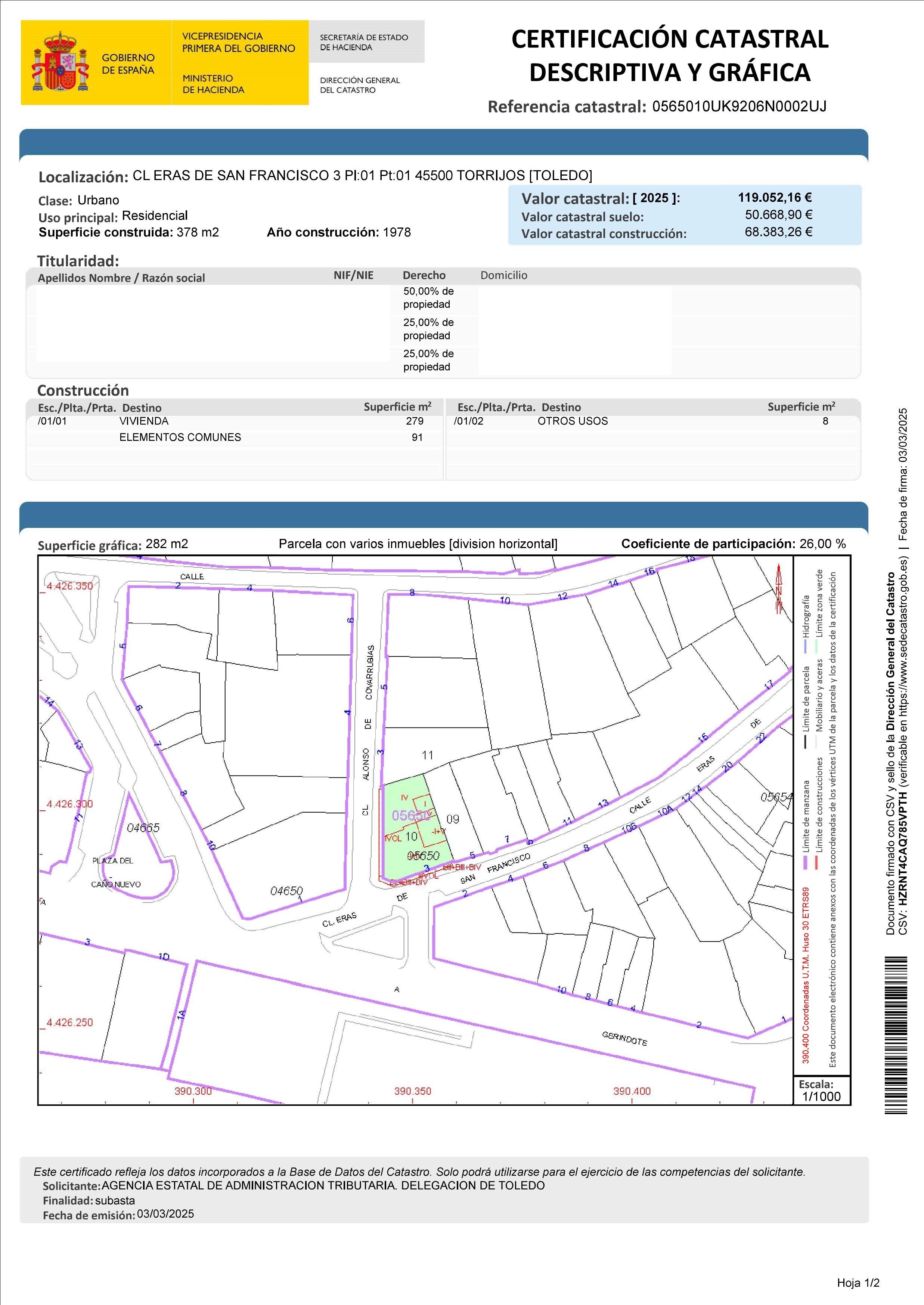 50 % DEL PLENO DOMINIO DE: URBANA. VIVIENDA EN PLANTA PRIMERA CON ENTRADA ORIENTADA AL NORTE, EN LA PLANTA PRIMERA DEL EDIFICIO EN TORRIJOS Y SU CALLE ERAS DE SAN FRANCISCO, NÚMERO TRES. MIDE UNA SUPERFICIE DE CONSTRUIDA DE DOSCIENTOS SETENTA Y SIETE METROS, ONCE DECÍMETROS CUADRADOS: SE COMPONE DE VESTIBULO, DISTRIBUIDOR, SALÓN, COMEDOR, DESPACHO, CINCO DORMITORIOS, DOS CUARTOS DE BAÑO, ASEO, COCINA, LAVADERO, DESPENSA, TENDERO AL PATIO Y UNA TERRAZA Y TRES BALCONES EXTERIORES.