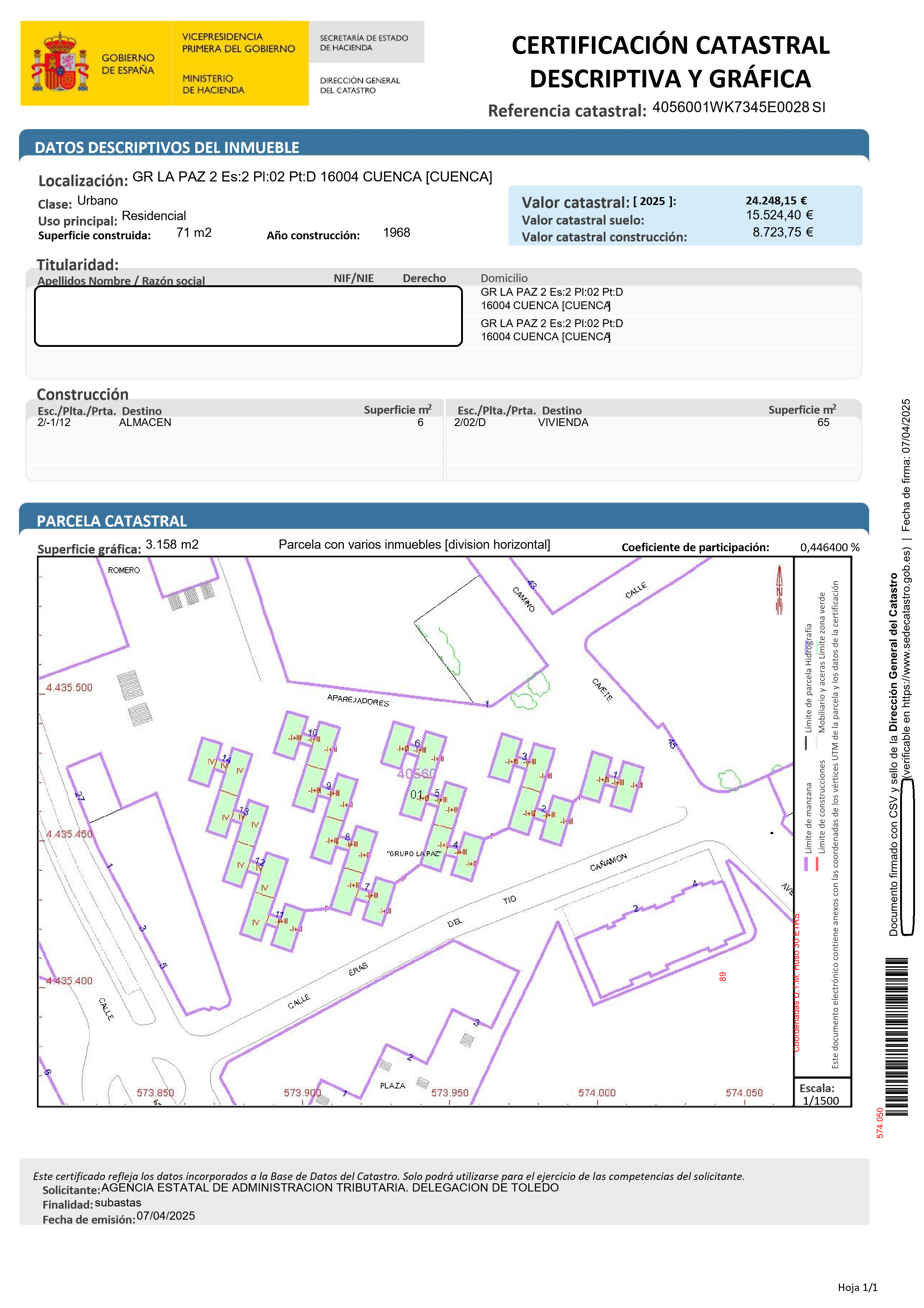 URBANA.- NÚMERO DOCE.- VIVIENDA SEGUNDO LETRA D, EN PLANTA SEGUNDA DE LA CASA NÚMERO DOS DEL GRUPO DE VIVIENDAS DENOMINADA LA PAZ , EN CUENCA, CON ENTRADA POR LA ESCALERA COMÚN. TIENE UNA SUPERFICIE CONSTRUIDA DE SESENTA Y CUATRO METROS, SETENTA Y NUEVE DECÍMETROS CUADRADOS. LINDA: FRENTE, CON CAJA DE ESCALERA Y ESPACIO LIBRE DE USO PÚBLICO DERECHA ENTRANDO, CON ESPACIO LIBRE DE USO PÚBLICO IZQUIERDA, CON VIVIENDA LETRA C DE SU MISMA PLANTA, DE LA QUE ESTA SEPARADA POR PARED MEDIANERA Y FONDO, CON ESPACIO LIBRE DE USO PÚBLICO. TIENE COMO ANEJO UN TRASTERO EN SEMISÓTANO. CUOTA: 6,25 POR CIENTO. CALIFICADA DEFINITIVAMENTE DEVIVIENDA DE RENTA LIMITADA POR RESOLUCIÓN DE 27 DE JUNIO DE 1968.