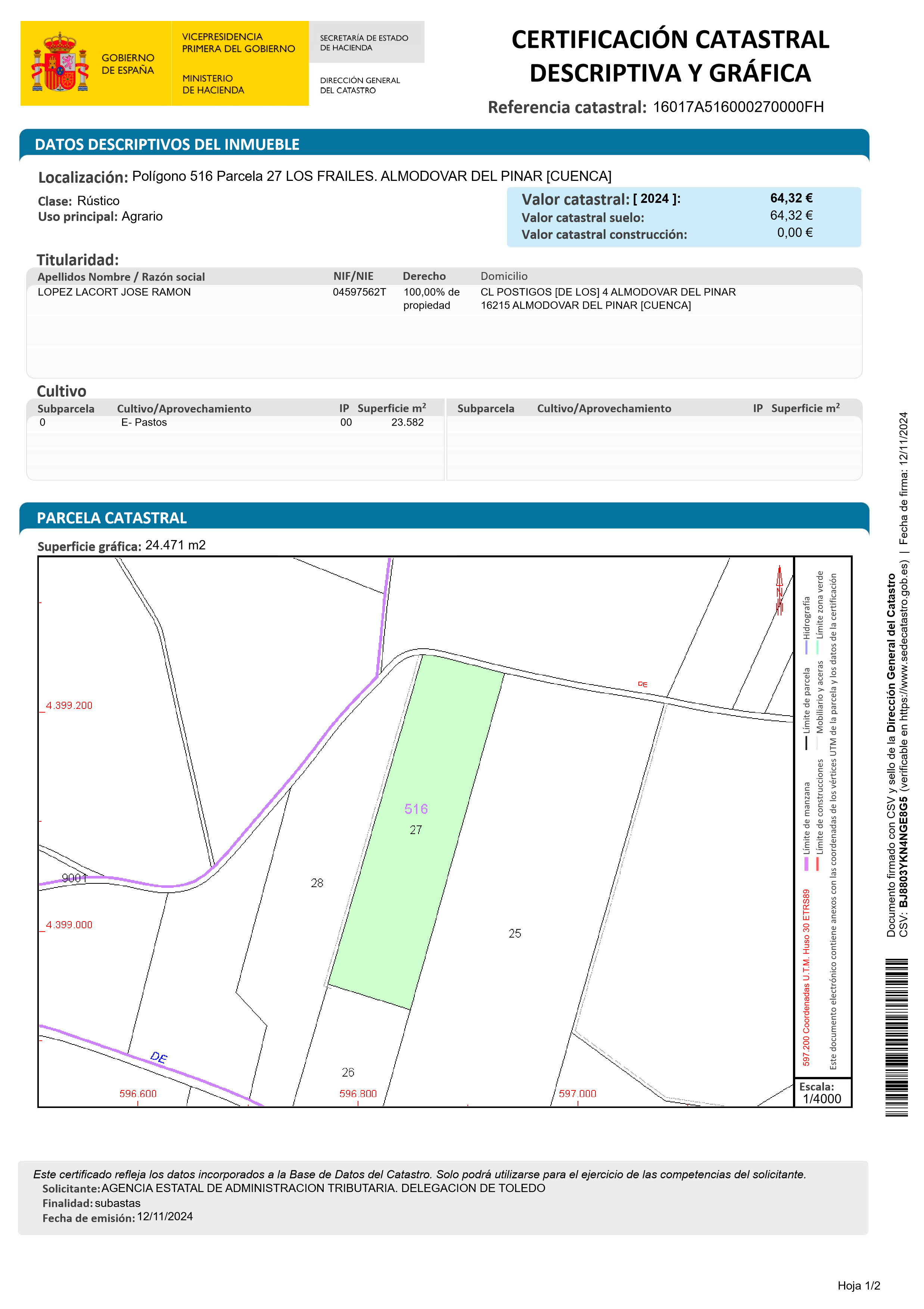 RUSTICA.- TIERRA DE PASTOS EN EL PARAJE FRAILES DEL T.M. DE ALMODOVAR DEL PINAR. TIENE UNA SUPERFICIE DE DOS HECTAREAS, TREINTA Y CINCO AREAS Y OCHENTA Y DOS CENTIAREAS. LINDEROS: NORTE, CAMINO DE LOS SANTOS Y MARINO SAIZ BRIZ (FINCA 28) SUR, HORACIO GARCIA MARTINEZ (FINCA 25) Y CAMARA AGRARIA PROVINCIAL DE CUENCA (FINCA 26) ESTE, HORACIO GARCIA MARTINEZ (FINCA 25) OESTE, MARINO SAIZ BRIZ (FINCA 28). ES LA PARCELA 27 DEL POLIGONO 16, CATASTRALMENTE POLIGONO 516