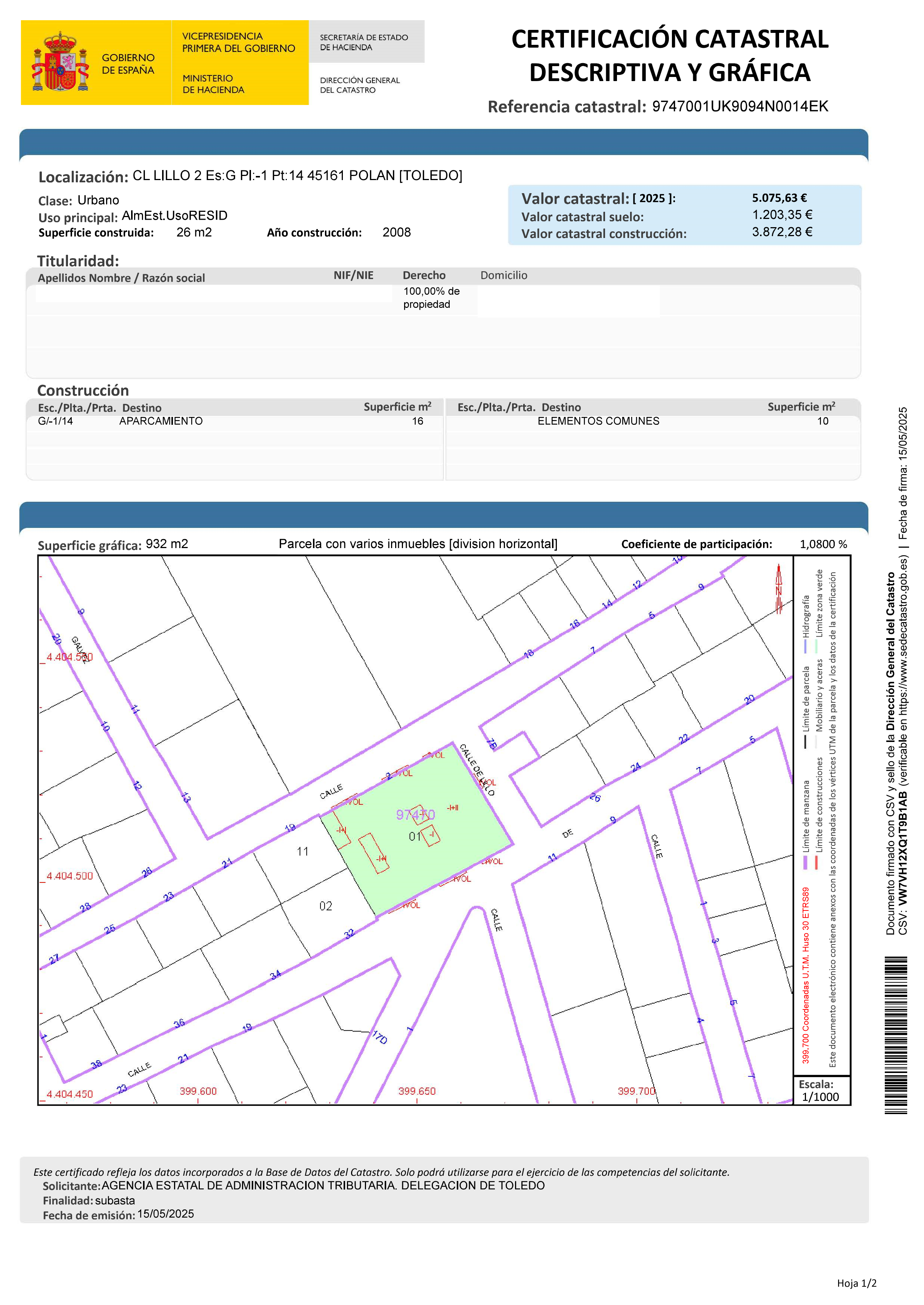 URBANA: PLAZA DE APARCAMIENTO NÚMERO 14, EN PLANTA SEMISÓTANO, EN CALLE LILLIO Nº 2, CON ENTRADA PARA VEHICULOS POR LA CALLE NAVAHERMOSA, EN POLÁN. NÚMERO DE PROPIEDAD HORIZONTAL 14. SUPERFICIE CONSTRUÍDA : 24 METROS Y 89 DECÍMETROS CUADRADOS. SUPERFICIE ÚTIL: 14 METROS. CUOTA DE PARTICIPACIÓN EN EL CONJUNTO/EDIFICIO: 0 ENTEROS Y 99 CENTÉSIMAS POR CIENTO.
