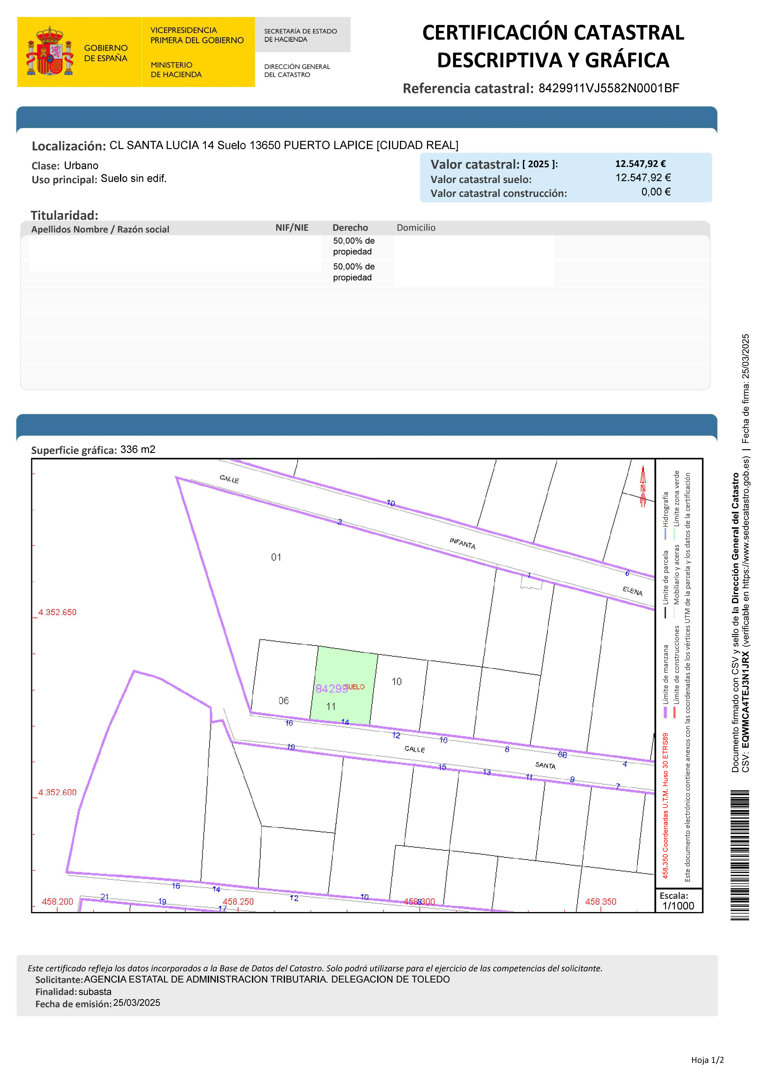 URBANA: SOLAR EN PUERTO LAPICE, CALLE SANTA LUCIA Nº 14, TIENE UNA SUPERFICIE DE 331 M2. LINDA: FONDO, ANGEL NAVARRO IZQUIERDA JOSE MARTIN DERECHA, CARLOS JIMENEZ Y FRENTE, CALLE DE SU SITUACION. SU REFERENCIA CATASTRAL ES: 8429911VJ5582N0001BF.