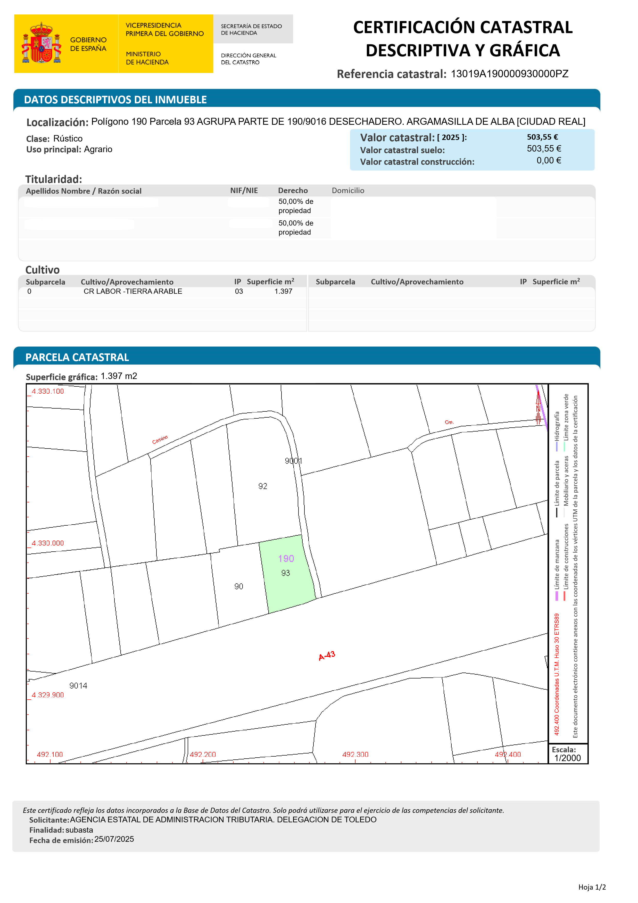 CLAVE DE USO:FINCA RUSTICA. 050,00% PORCENTAJE DEL INMUEBLE SUJETO AL DERECHO. SUPERFICIE ELEMENTO ASOCIADO AL SUELO:1397
