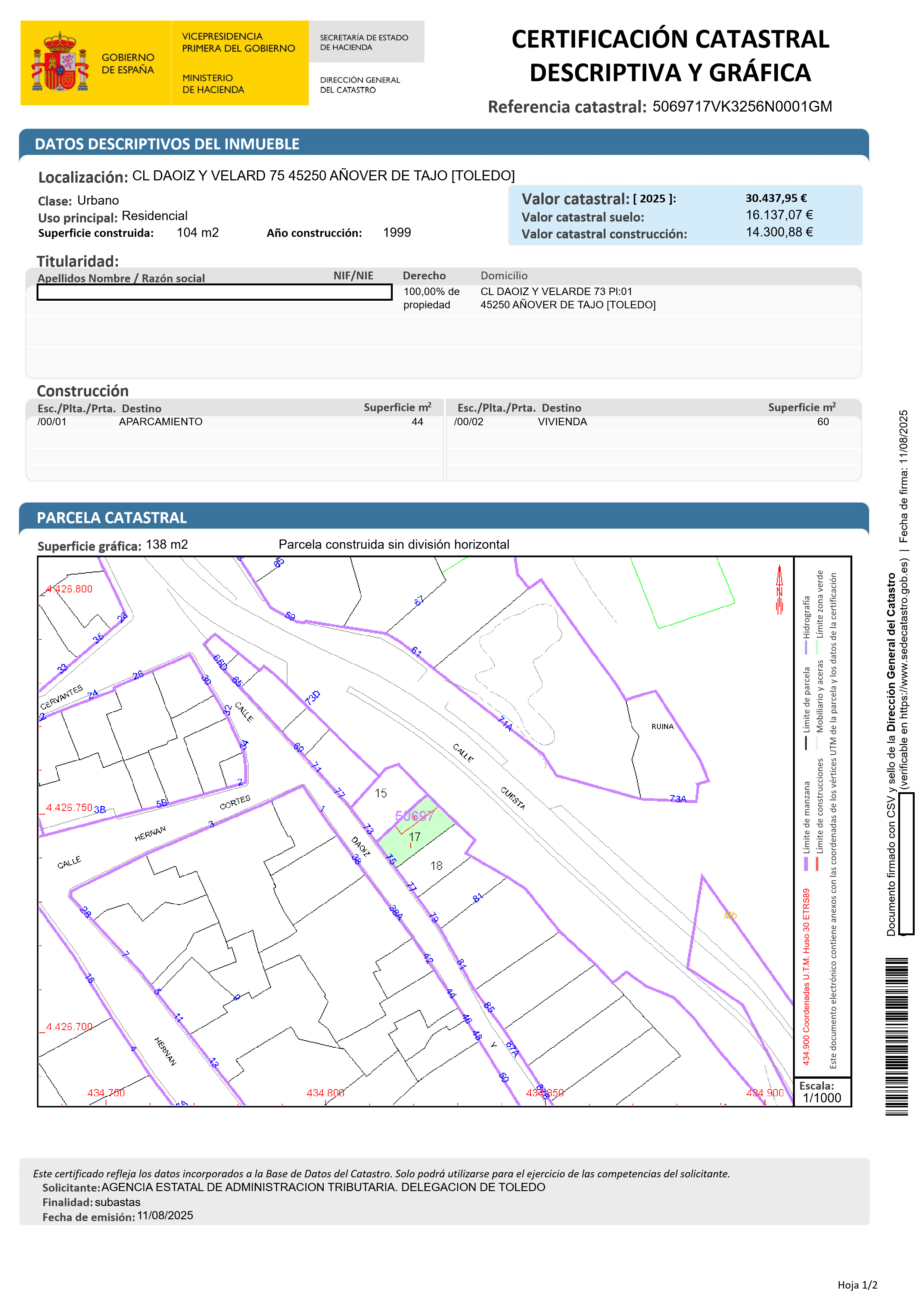 NATURALEZA: URBANA. SOLAR. OCUPA UNA SUPERFICIE DE 139M2. LINDEROS FRENTE: CALLE DE SU SITUACIÓN. DERECHA: ALEJANDRO DÍAZ. IZQUIERDA: MOISÉS DÍAZ. ESPALDA: CARRETERA DE OCAÑA AL PUENTE DE LA PEDRERA.
