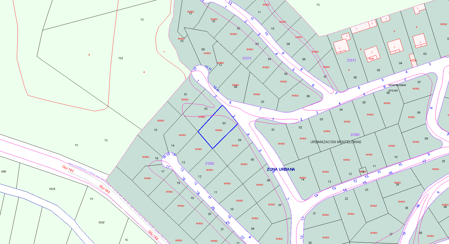 100% PLENO DOMINIO. URBANA: PARCELA 3 DE LA MANZANA I, PERTENECIENTE A LA URBANIZACIÓN MONTELOMAS, EN TÉRMINO MUNICIPAL DE COGOLLUDO (GUADALAJARA). OCUPA UNA SUPERFICIE DE QUINIENTOS UNO CON SETENTA METROS CUADRADOS. LINDA: AL NORTE, CON CALLE TRANSVERSAL NÚMERO 8 SUR, CON PARCELAS 15 Y 16 ESTE, CON PARCELA 4 Y OESTE, CON PARCELA 2.