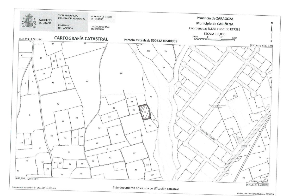 100% PLENO DOMINIO VIÑEDOS DE REGADIO EN EL TÉRMINO MUNICIPAL DE CARIÑENA, EN LA PARTIDA LOS CADOS, DE UNA SUPERFICIE DE SETENTA Y NUEVE ÁREAS SESENTA Y DOS CENTIÁREAS. LINDA: NORTE, PARCELA 60 SUR, PARCELA 49 ESTE, PARCELAS 72 Y 74 OESTE, PARCELAS 50 Y 36. POLÍGONO 105, PARCELA 69. REFERENCIA CATASTRAL: 50073A105000690000MT. CÓDIGO REGISTRAL ÚNICO: 50007000737412.