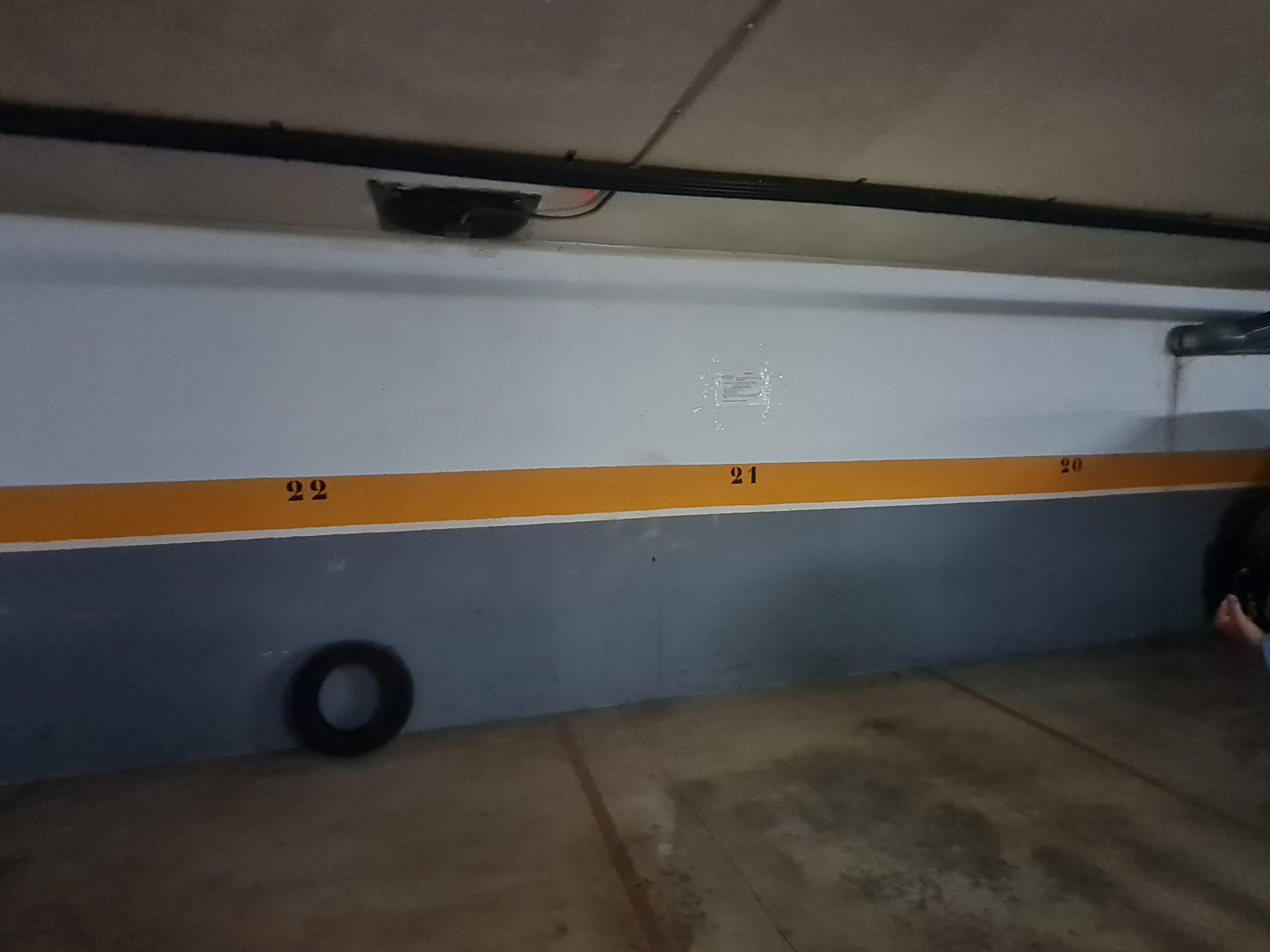 Frente, zona de circulación y maniobra; Derecha, plaza de aparcamiento demarcada con el número 20; Izquierda, plaza de aparcamiento demarcada con el número 22; Fondo, muro del sótano.