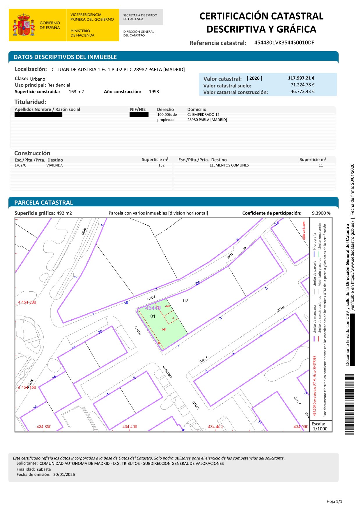 VIVIENDA EN LA CALLE JUAN DE AUSTRIA, N.º 1, 2ª PLANTA, LETRA C, DE PARLA (MADRID). SUPERFICIE ÚTIL APROXIMADA: 144,91 METROS CUADRADOS